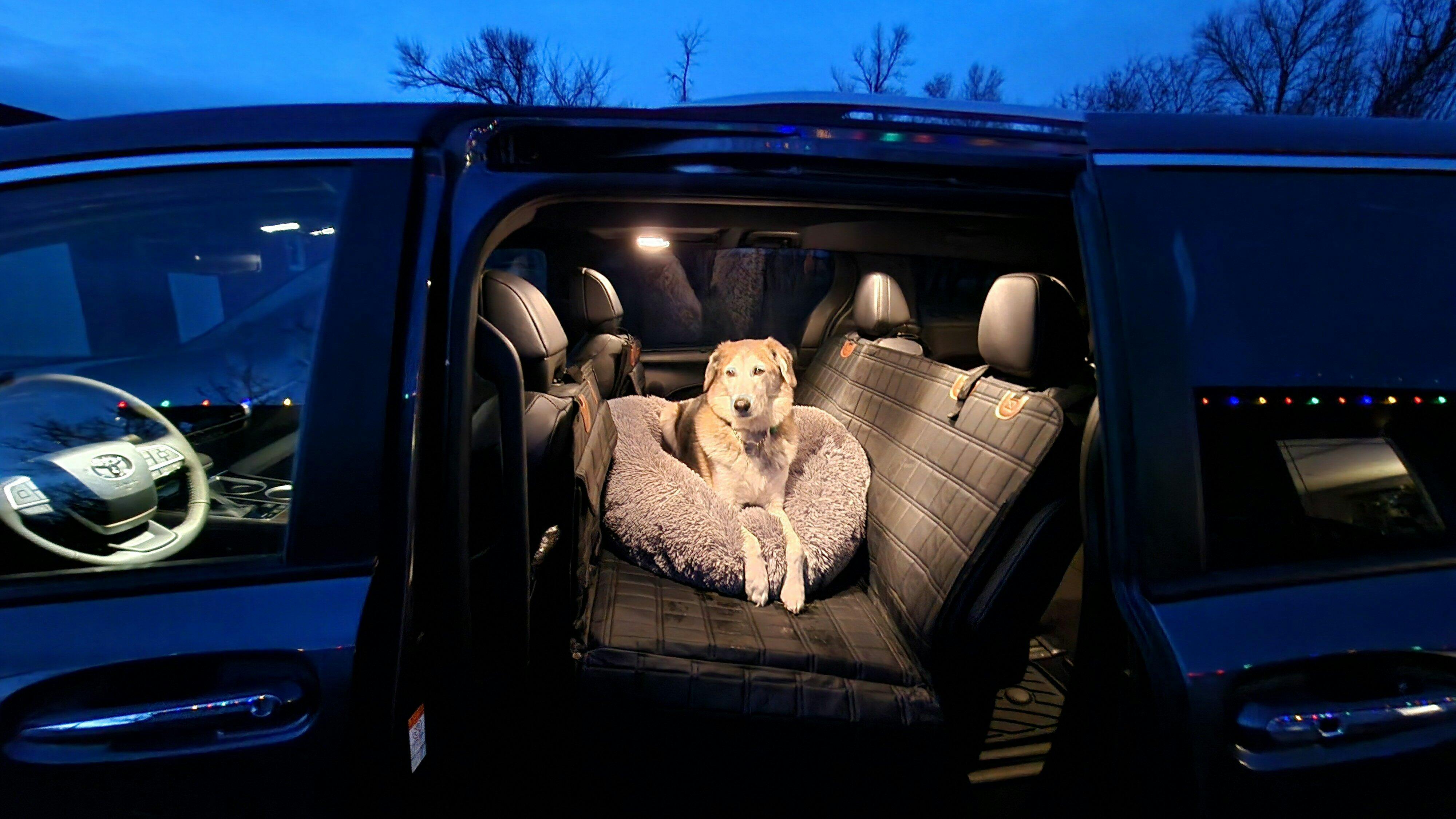 We recently purchased a mini van and needed a solid-based hammock for our dog on roadtrips. The van, a Toyota Sienna, has captain/bucket seats for the 2nd row. I measured the distance between seats and it awarded a few inches of overlap from the middle base in hammock.